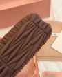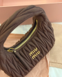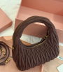 The MIU MIU Wander Collection Crescent Moon Bag, crafted from soft suede with an elegant, curved silhouette, exudes a retro-modern vibe. The bag's dark brown exterior offers a calming, refined feel, and detailed with the exquisite metal engraving of the brand's logo, highlighting the brand's unique charm.