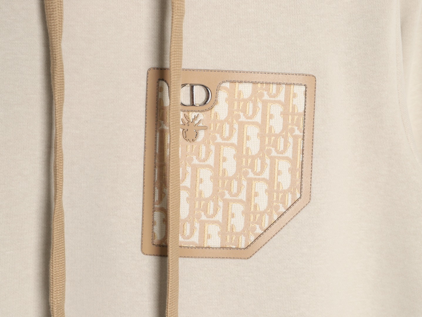 The sweatshirt's most striking feature is the meticulously crafted irregular slant pockets, which break with the traditional symmetry of pockets and become the visual centerpiece of the garment with their unique angle. Made from high-quality leather, the slant pockets boast a delicate, lustrous surface and a firm, resilient feel, creating a striking textural contrast with the sweatshirt's cotton fabric. The ingenious material combination showcases the craftsmanship. Even more noteworthy is the custom hand-sewn CD hardware. The hardware is rich in gloss, and the CD lettering is clearly and neatly engraved, without any fuzzy edges. The hand-sewing process ensures that the accessories are secure and will not fall off, instantly enhancing the exquisite look. Furthermore, the oversized, three-dimensional slant pockets provide practical storage for essentials like phones and keys, while also allowing for casual pocketing, balancing aesthetics with practicality. V. Sizing and Fitting: Suitable for a variety of body shapes, versatile and easy to style.