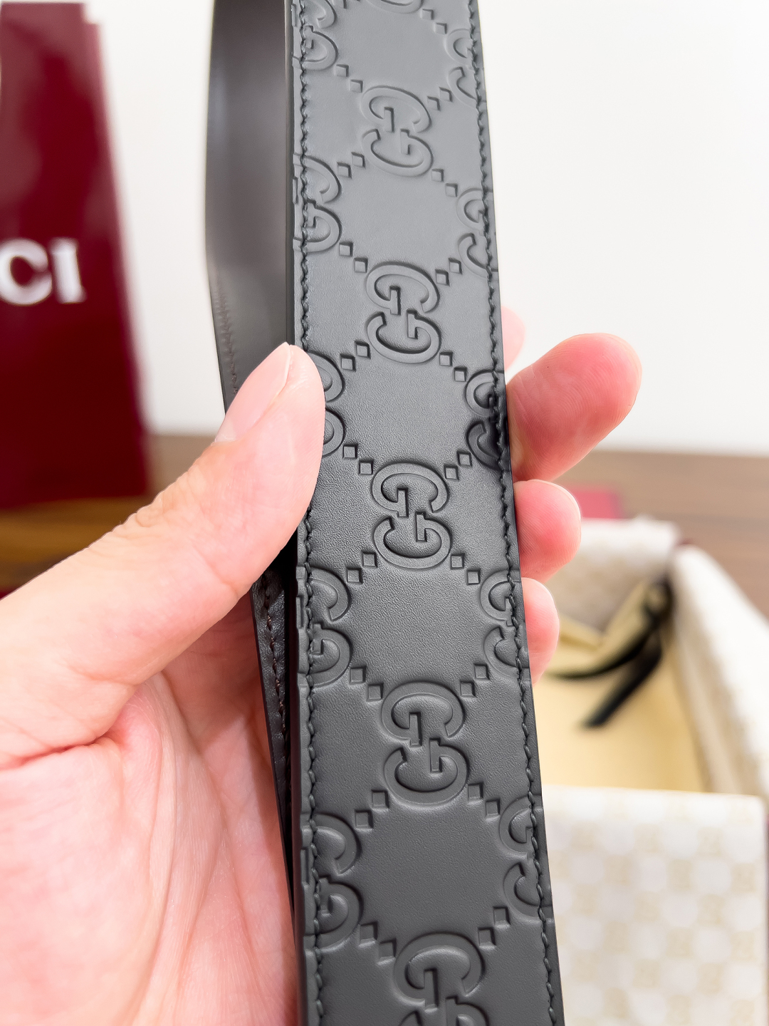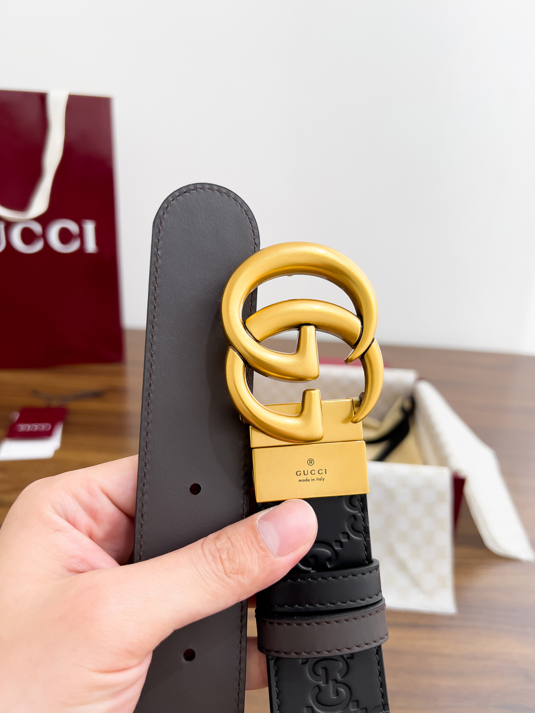 This Gucci double-sided belt is crafted from top-grain calfskin, meticulously embossed for a delicate, three-dimensional texture. It features a brown calfskin base and is reversible, combining practicality and aesthetics. Crafted using the Durkopp oblique stitching technique, the stitching is even and tight, showcasing meticulous attention to detail. The custom-made pure copper buckle creates a timeless, understated luxury.